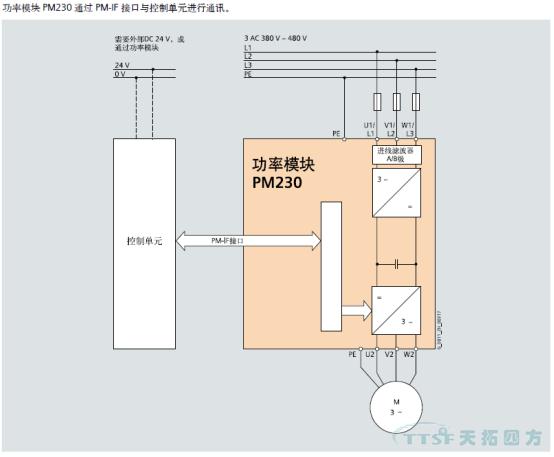 • PM-IF 接口,用于将功率模块 PM230 连接至控制单元。功率单元 PM230 通过集成的电源组件向控制单元供电。